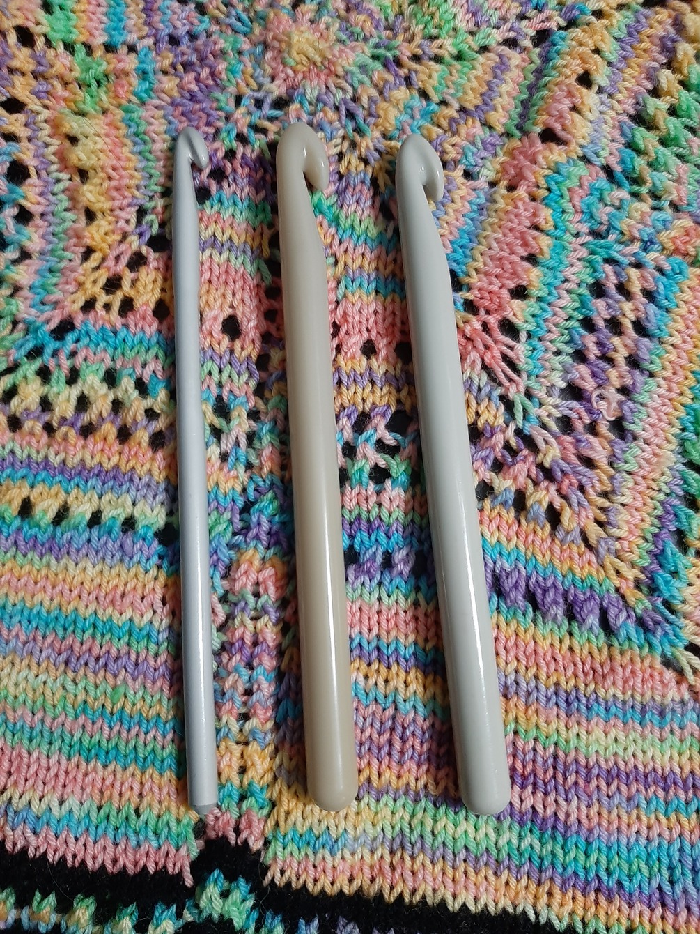 Over the years I've inherited a lot of crochet hooks, including these examples: One metal, one plastic, and one that I believe is bakelite. They are all in shades of grey and include sizes K and N. The bakelite hook (middle, yellowish tone) is a size that is nonstandard today and falls somewhere between N and O, about 16mm.